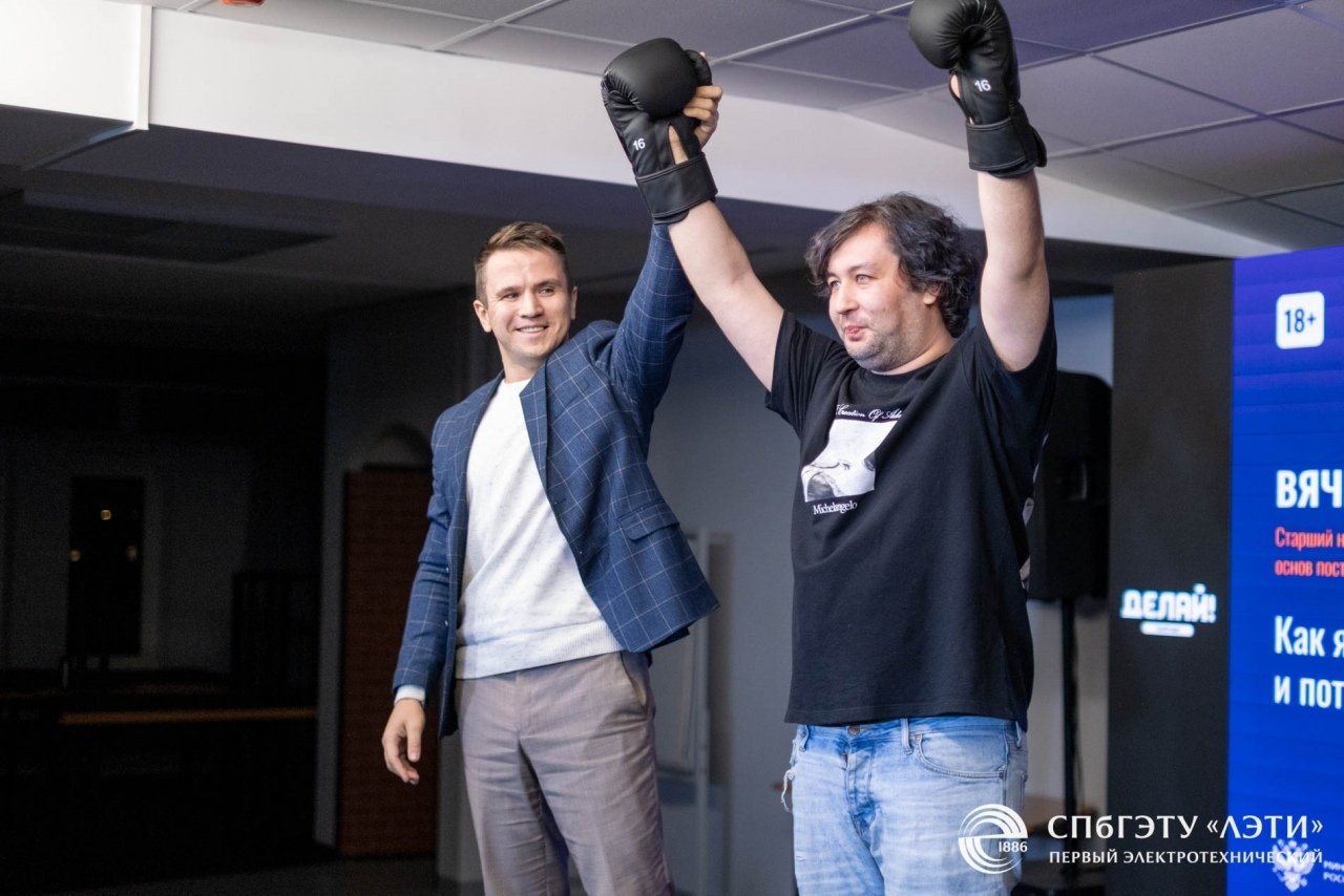 13 октября организаторы подготовили для студентов квест, посвящённый главному событию месяца – Science Slam LETI-2025. А уже 17 октября в научной «битве» молодые исследователи представили свои проекты в увлекательной форме, показав, что наука может быть яркой и захватывающей. Победитель был определён по силе и продолжительности аплодисментов зрителей. По версии аудитории лучшим стал старший научный сотрудник лаборатории фундаментальных основ построения интеллектуальных систем СПбГЭТУ «ЛЭТИ» Вячеслав Гульванский. Новоиспечённому чемпиону боксёрские перчатки символично передал победитель Science Slam прошлого года – старший преподаватель кафедры информационной безопасности СПбГЭТУ «ЛЭТИ» Евгений Шкляр. В дальнейшем Вячеслав Гульванский сможет представлять ЛЭТИ на региональном этапе Университетской Лиги Science Slam.