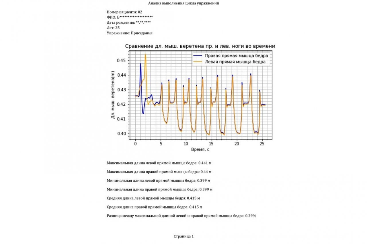 «В результате работы была разработана программа для выявления нарушений в опорно-двигательном аппарате спортсменов, которая позволяет создавать принципиально новый формат отчёта. Тренер, или специалист может получить не сырые данные, а наглядную визуализацию и готовые расчёты. С помощью программы можно автоматизировать процесс формирования документа, моделировать графики изменения длины мышц и вычислять основные параметры этих изменений, и самое главное – наглядно оценить симметрию или асимметрию в работе правой и левой конечностей».